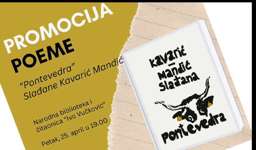 U petak, 25. aprila u 19 časova u Narodnoj biblioteci i čitaonici “Ivo Vučković” biće upriličena promocija poeme “Pontevedra” Slađane Kavarić Mandić.