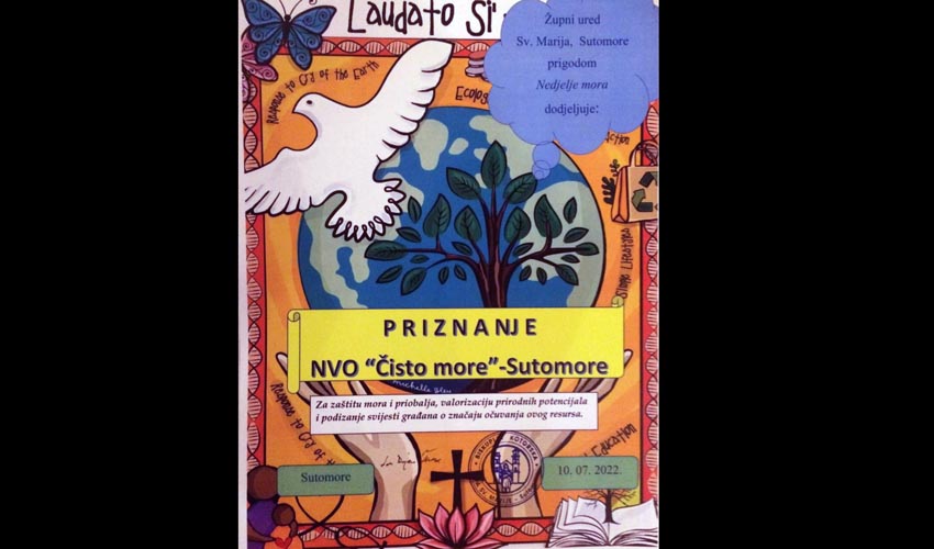 Marina Zgradić, polaznica programa cjeloživotnog obrazovanja na Hrvatskom katoličkom sveučilištu u Zagrebu „Laudato si’! Dijalogom do cjelovite ekologije“ i vjernica iz Poljske, pročitale su na našem i poljskom jeziku ulomke iz enciklike Laudato sí – LS 40 i 41 u kojima je istaknuta ugroženost biljnog i životinjskog svijeta u rijekama, jezerima, morima i oceanima. Nekontroliranim i selektivnim izlovom, u kojem se veliki dio ulova baca, ugrožava se cjelokupni hranidbeni lanac. Mnogi su koraljni grebeni opustošenim što je najvećim dijelom rezultat onečišćenja mora kroz iskrčivanje šuma, poljoprivredne monokulture, industrijski otpad i destruktivne metode ribolova. Te posljedice ne opažaju se na prvi pogled, ali čovječanstvo već plaća danak uništenja. Stoga je važna svaka akcija u drugom smjeru. Zato je ove godine uručeno priznaje nevladinoj organizaciji „Čisto more“ iz Sutomora za doprinos zaštiti mora i priobalja, valorizaciji prirodnih potencijala i podizanje svijesti građana o značaju očuvanja ovog resursa.