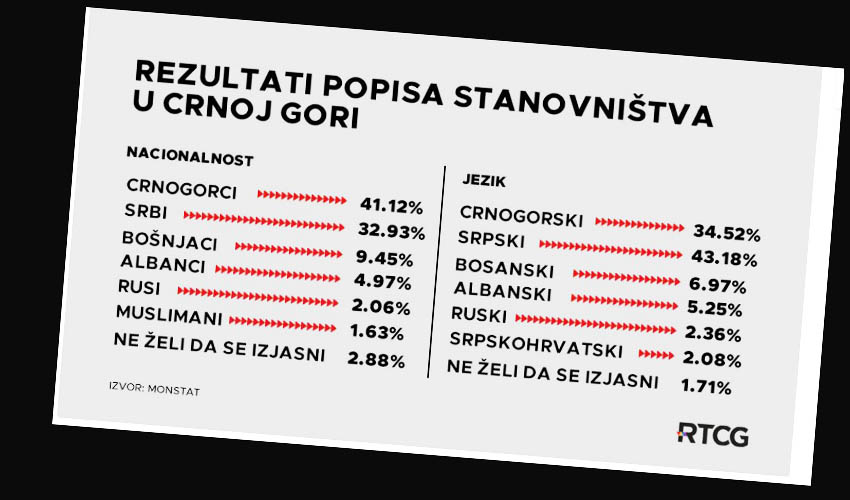 Crnogoraca 41,12 odsto, Srba 32,39 odsto, srpskim jezikom govori 43,18 %