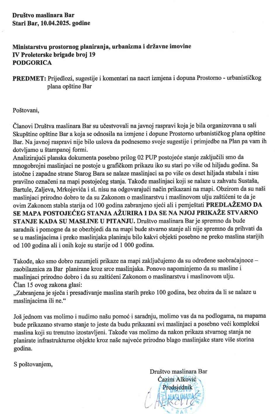 Društvo maslinara Bar je kao i uvjek, u skladu sa procedurom Ministarstva prostornog planiranja i urbanizma pisanim putem preko arhive (smatrali smo da nije potrebno slati i medijima obavještenje ) Ministarstvs dostavili naše primjedbe i preporuke na prijedlog izmjena i dopuna Prostorno urbanističkog plana . Naravno, ostali smo svoju spremnost da damo doprinos da aktuelne mape budu ažurirane u skladu sa stvarnim stanjem na terenu.