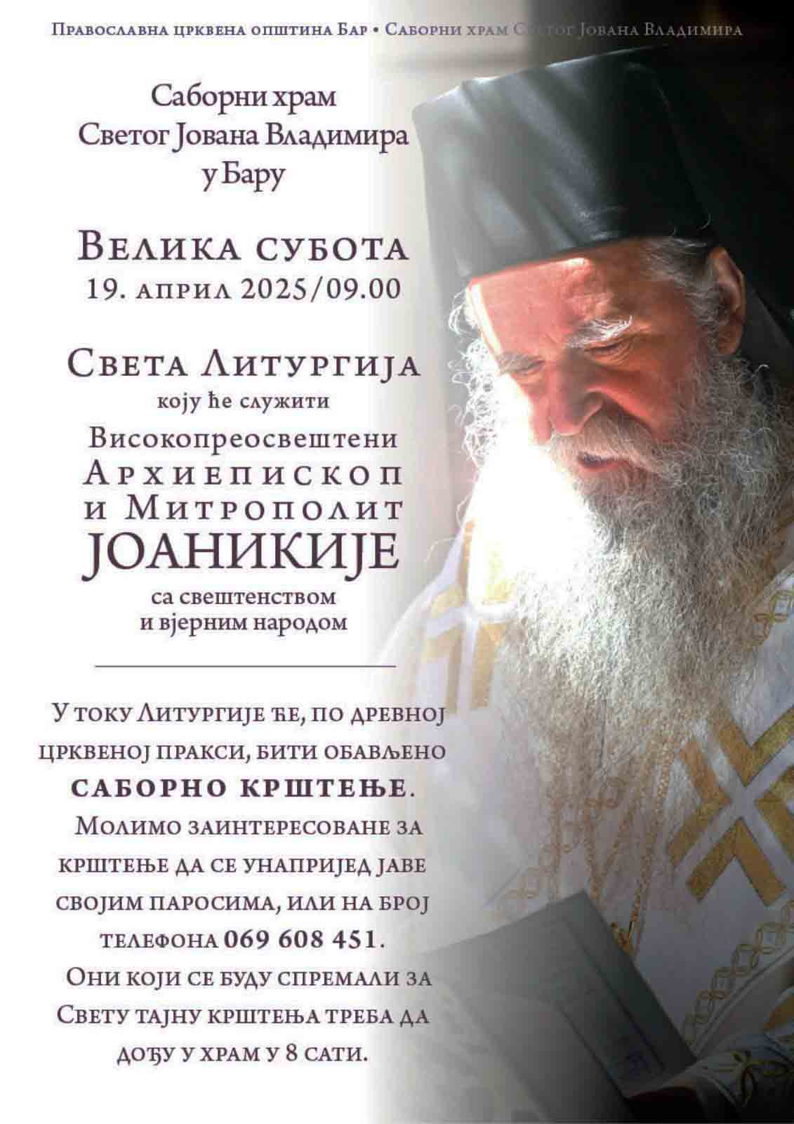 Njegovo visokopreosveštenstvo Mitropolit crnogorsko-primorski g. Joanikije sa sveštenstvom i vjernim narodom služiće na Veliku subotu, 19. aprila, Svetu arhijerejsku liturgiju u Sabornom hramu Svetog Jovana Vladimira u Baru, sa početkom u 9 časova.